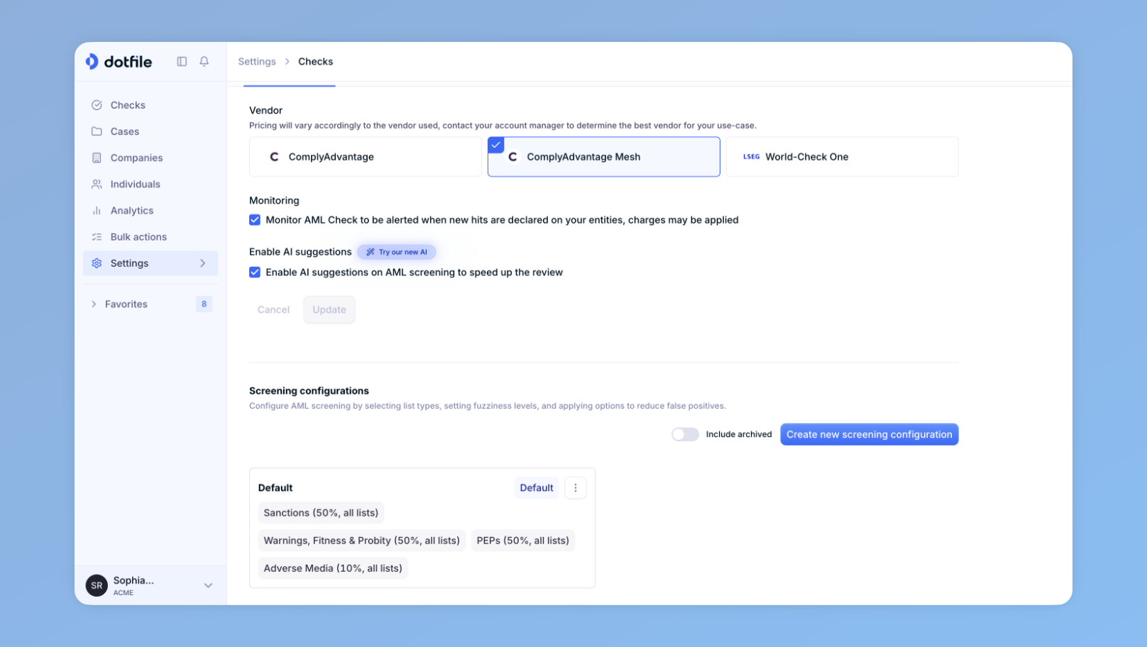 You can now define your screening configuration directly in Dotfile Settings with the new ComplyAdvantage Mesh integration: