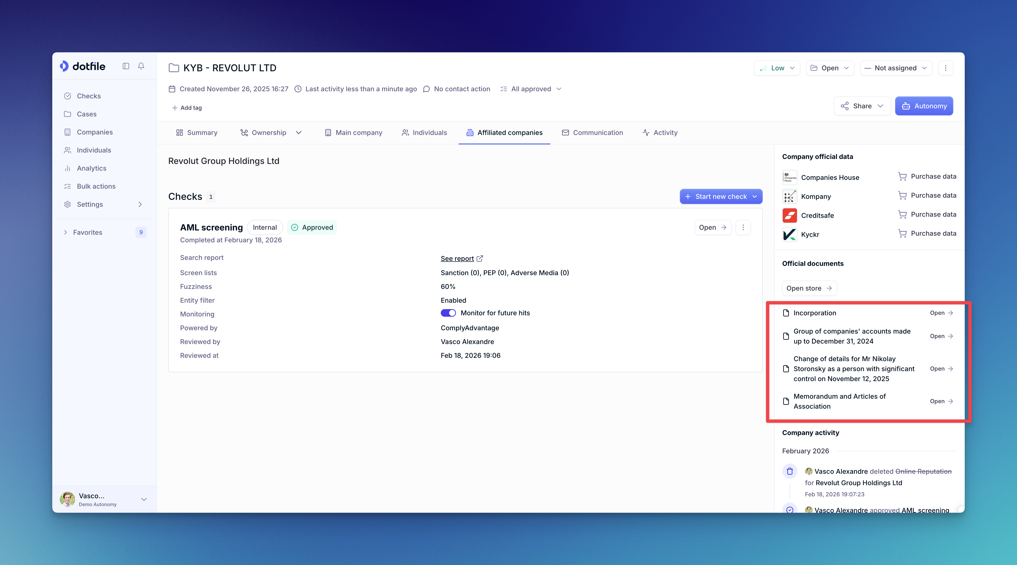 Auto Purchase allows you to automatically order official company documents such as registration certificates, financial accounts, articles of association, and UBO registry extracts from external providers as part of your compliance workflow.