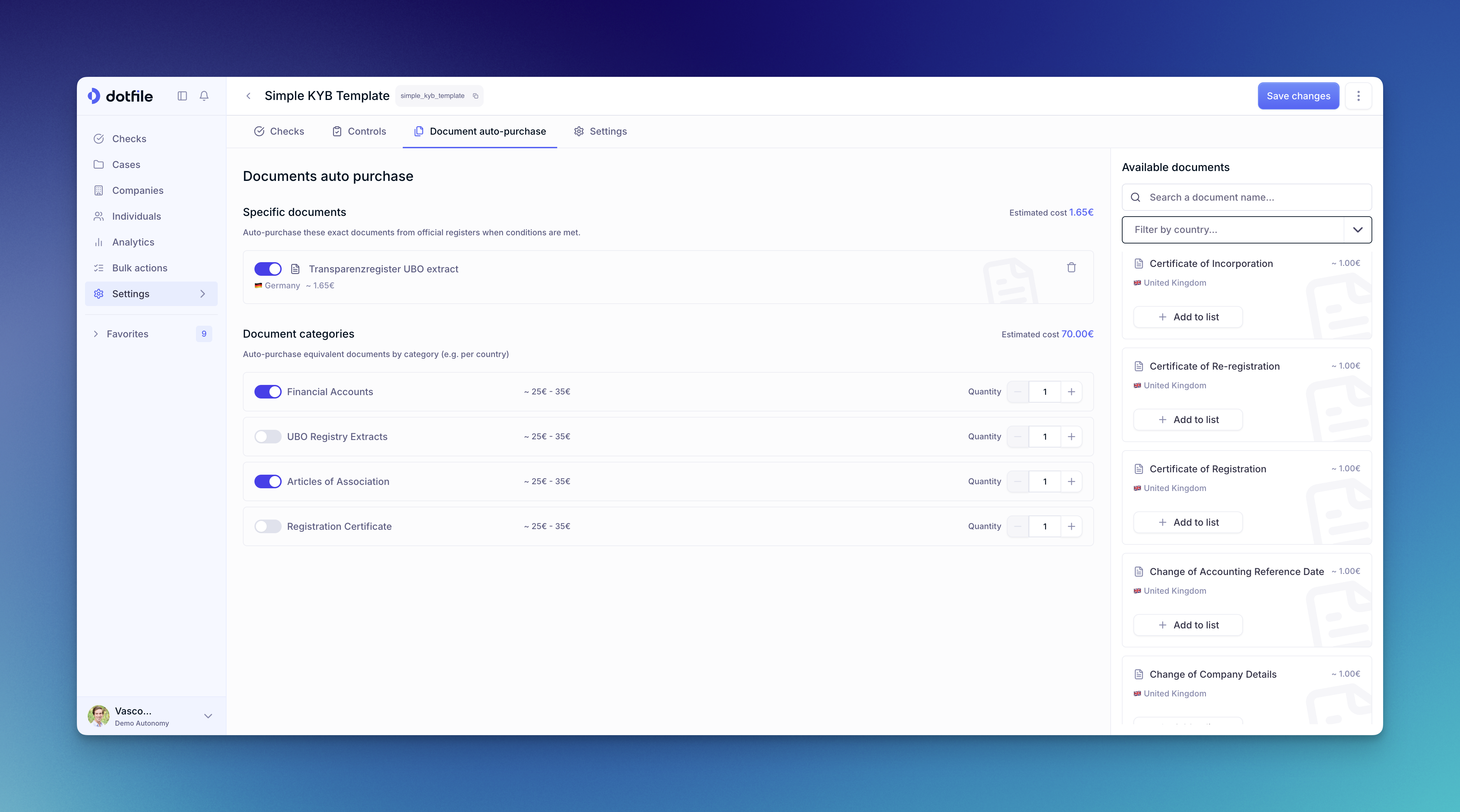 Automatic vendor matching: Dotfile automatically selects the right vendor and document based on the company's jurisdiction. If a vendor offers multiple document types for a country, you choose which ones to include.