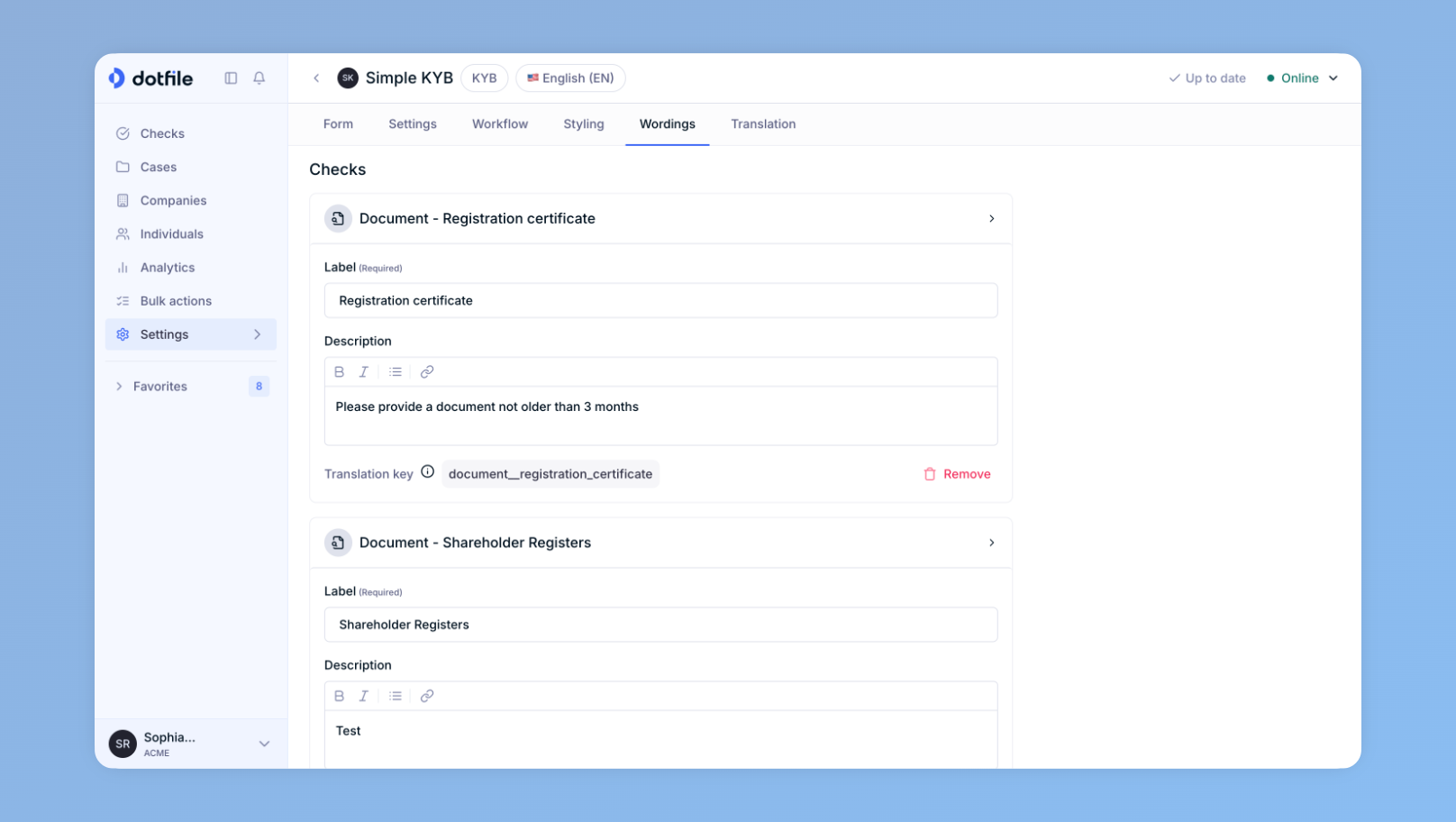 Wordings can be customized in the dedicated Wordings tab of the Client Portal editor. Once you have set a wording for a specific check, it can also be translated in several languages through our Internationalization feature.