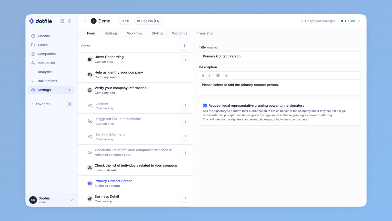 While identifying the business contact is mandatory for every KYB application, identifying the signatory and delegator is optional.