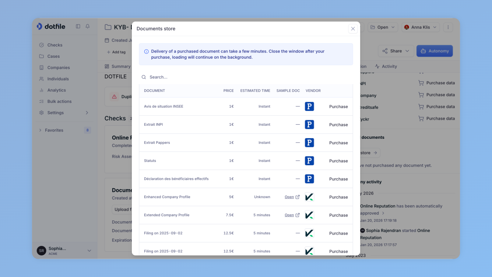In the Dotfile Console, you can purchase company documents from official sources in more than 100 countries. This gives you access to valuable official documents, allowing you to avoid asking the user to provide information and reducing friction. You don’t have to worry about their authenticity, either, thus speeding up reviews. To order documents, navigate to the Company Profile and access the Document Store, on the right side panel.
