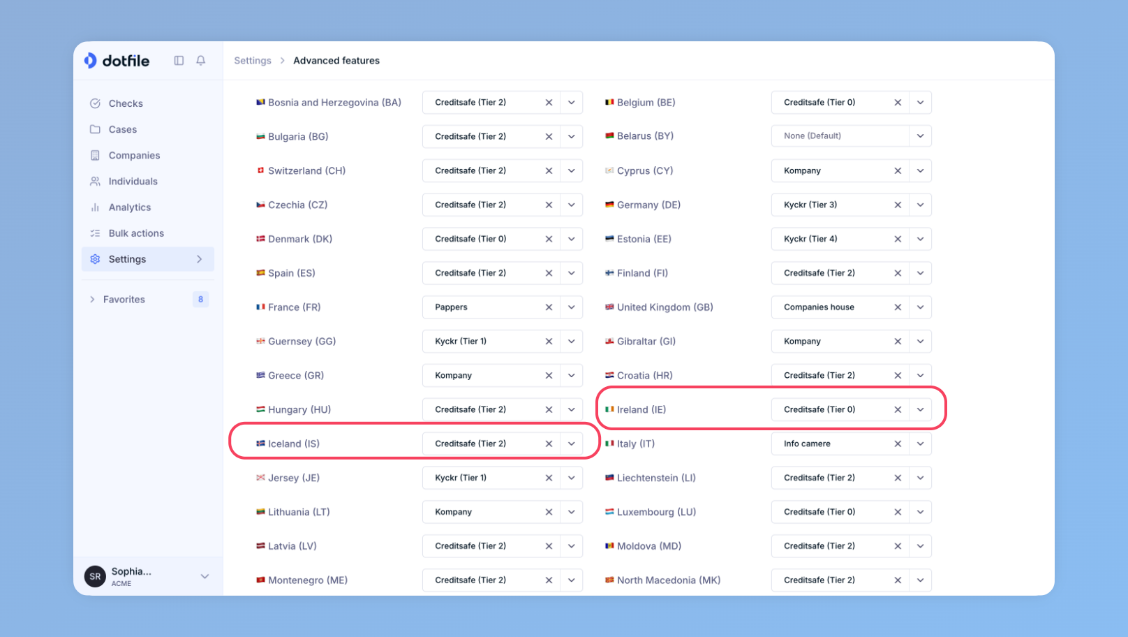 To see which countries are covered by Creditsafe and/or Kyckkr and in which tier, you can go to advanced features and then company data enrichment.