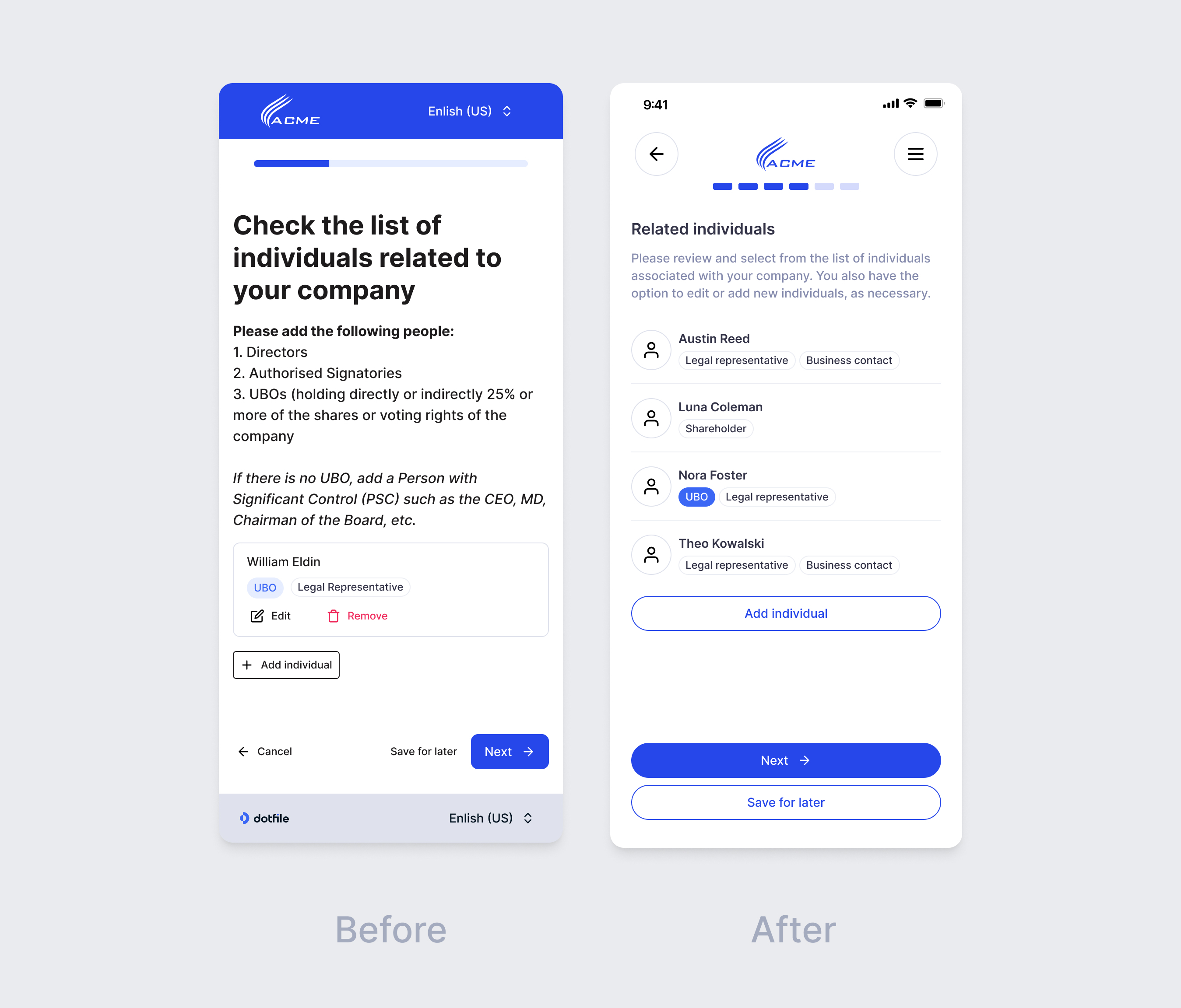 - Companies & Individuals: add checks (with required inputs where applicable)