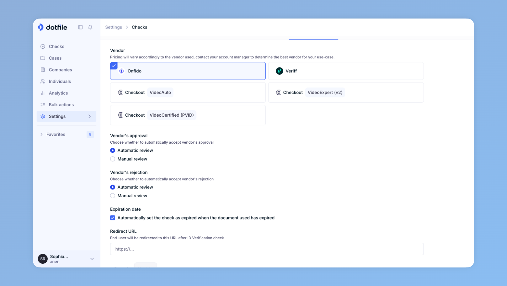 Choose your preferred provider between Veriff, Checkout, and Onfido