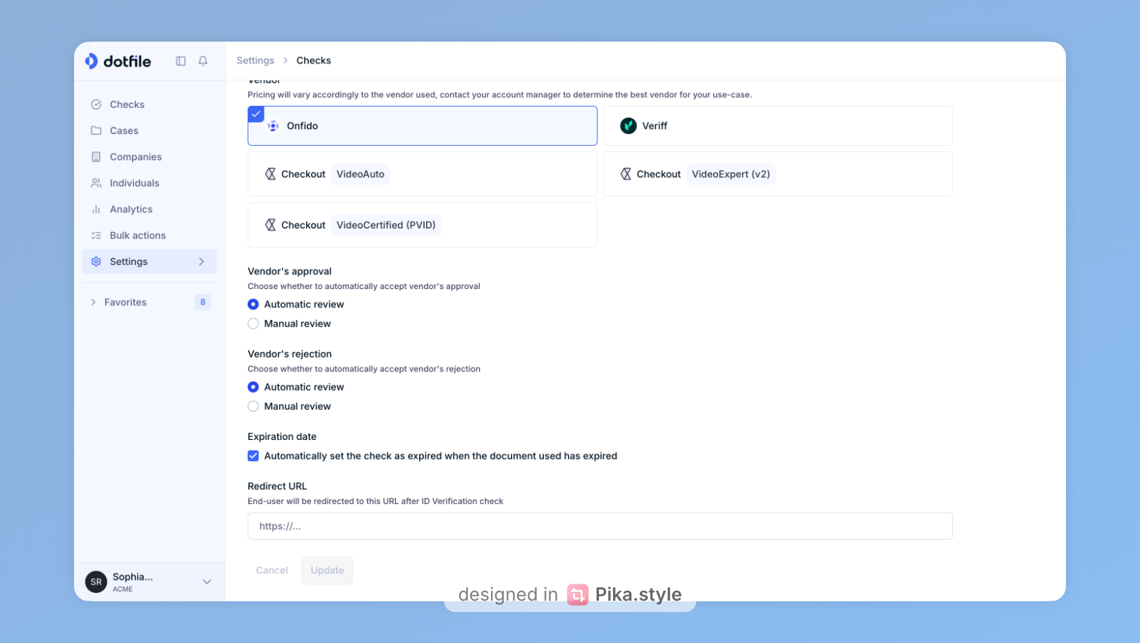 To enable Onfido, navigate to your settings and select Onfido as your verification provider.