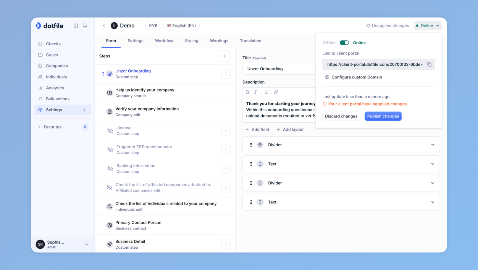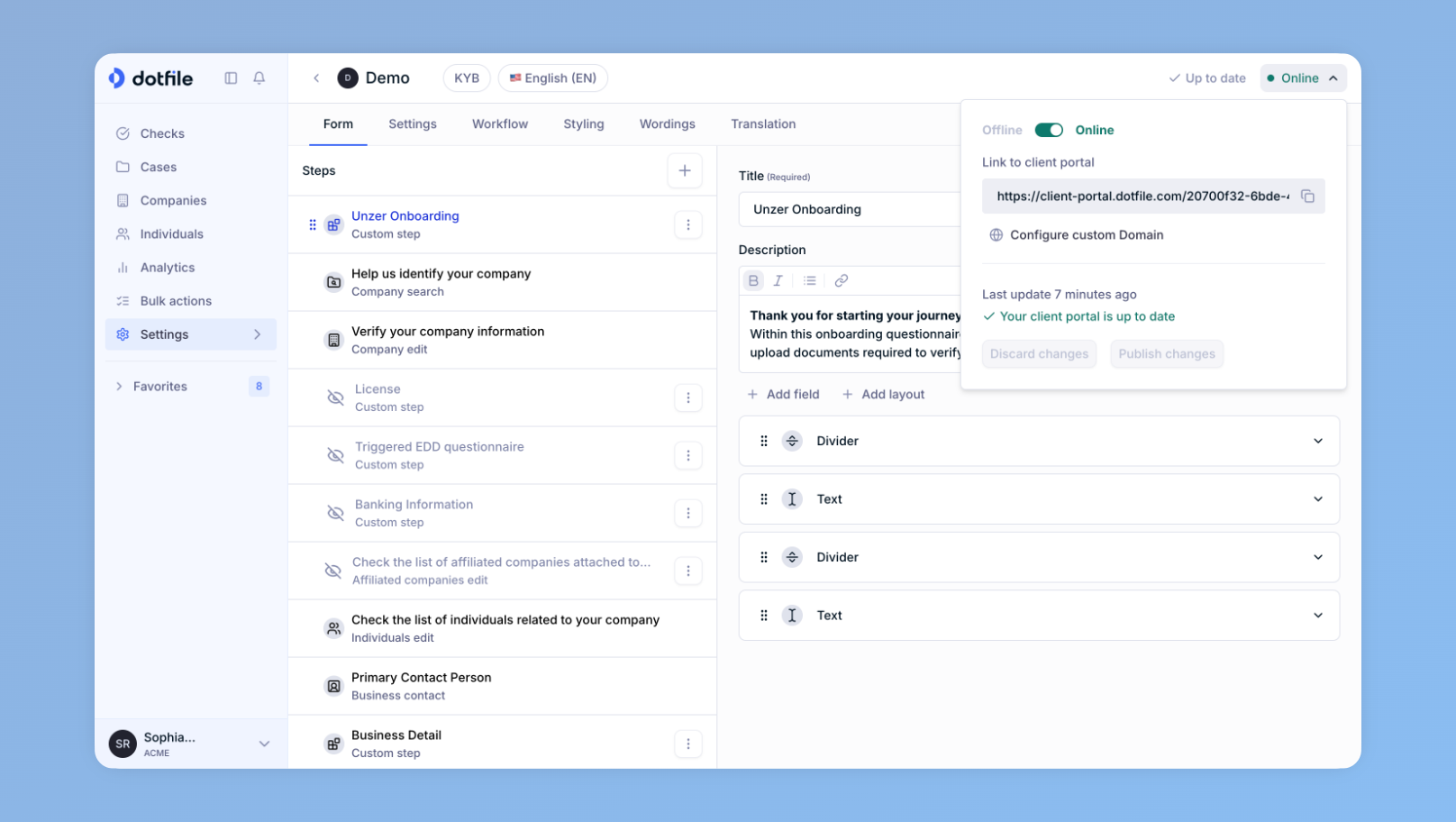 The client portal is automatically saved as you build it, and you can publish it at any time. To publish, simply set your client portal online using the option in the top right corner of the editor.