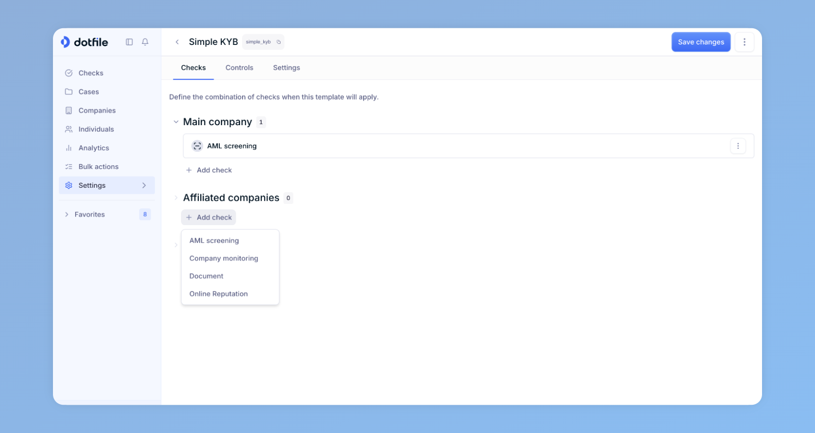 Configure Checks: For each company and key individual, select relevant checks. Templates can be executed sequentially, adding more checks to the Case.