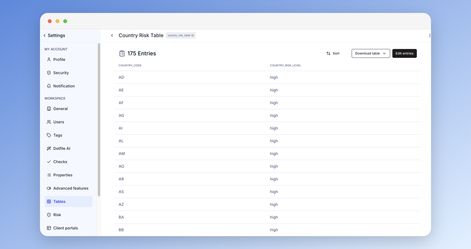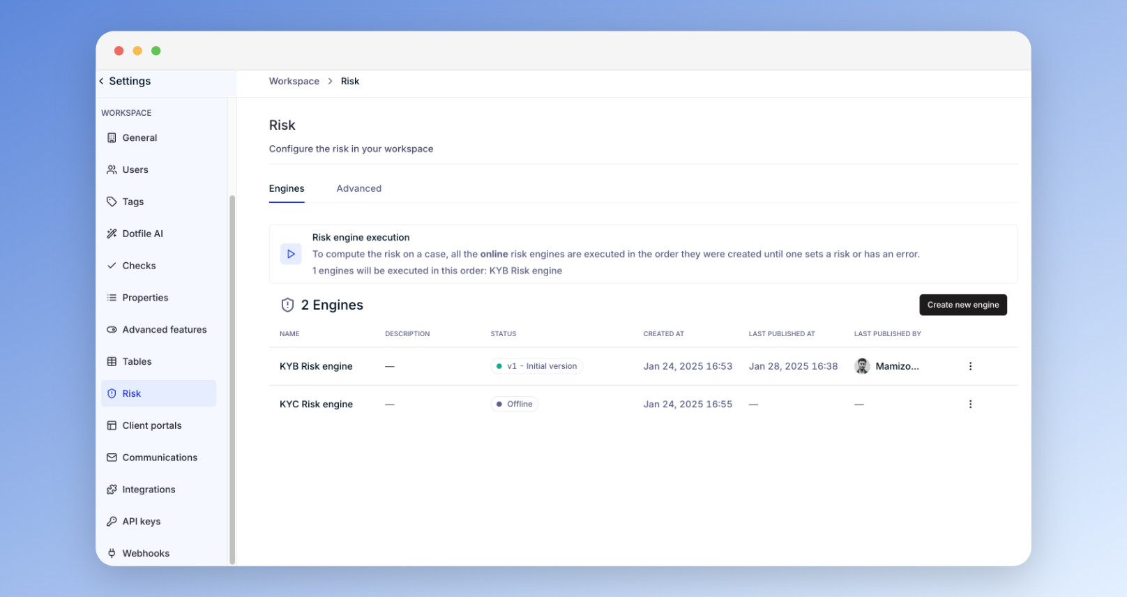 Your risk engine should leverage centralized data in Dotfile, including data collected through the Client Portal, manual inputs, or external sources integrated via API. If you need to adjust the risk assessment rules, our team is available to guide you and support updates effectively.