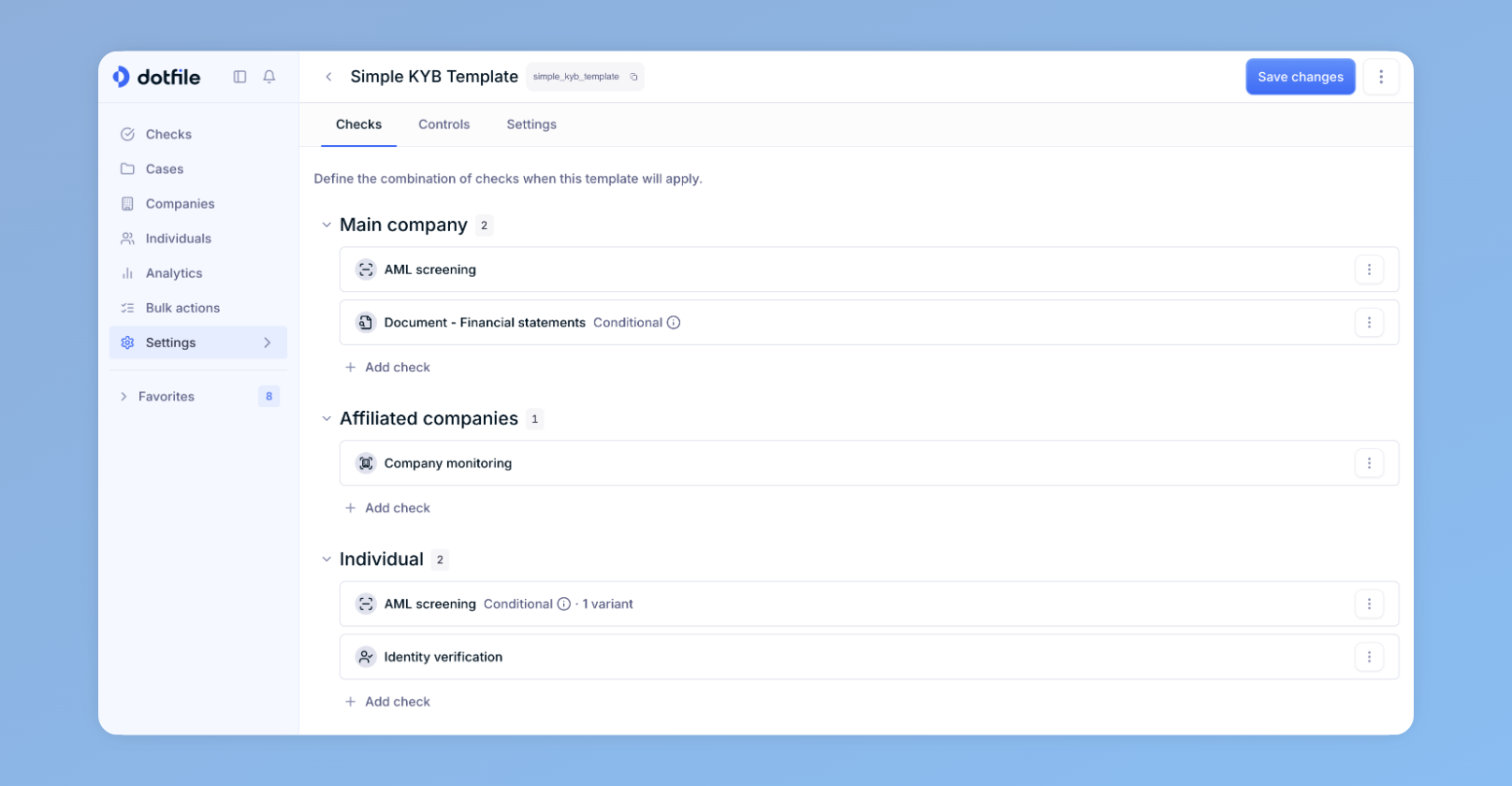 Templates allow you to define a list of checks and controls to be run on a Case. With Templates it’s easy to define that all the Cases created with a specific trait (company legal form, company country) undergo the same verifications, without having to manually launch each of them.