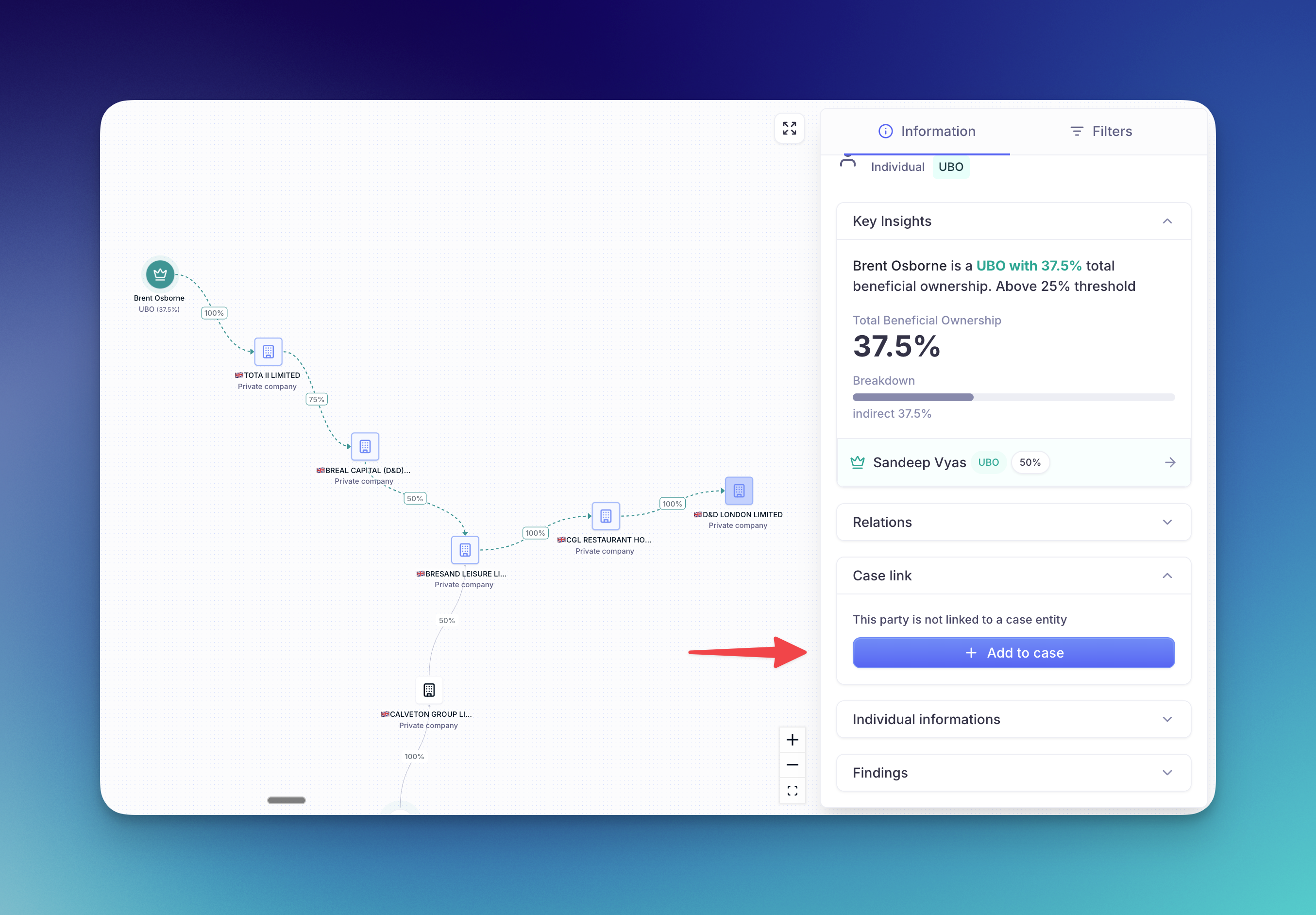 When you create a case with a main company, Dotfile automatically initiates an initial ownership unravelling using any company data already purchased. The system fetches registry data, uses AI to extract ownership structures and builds an interactive graph showing all parties and their relationships.