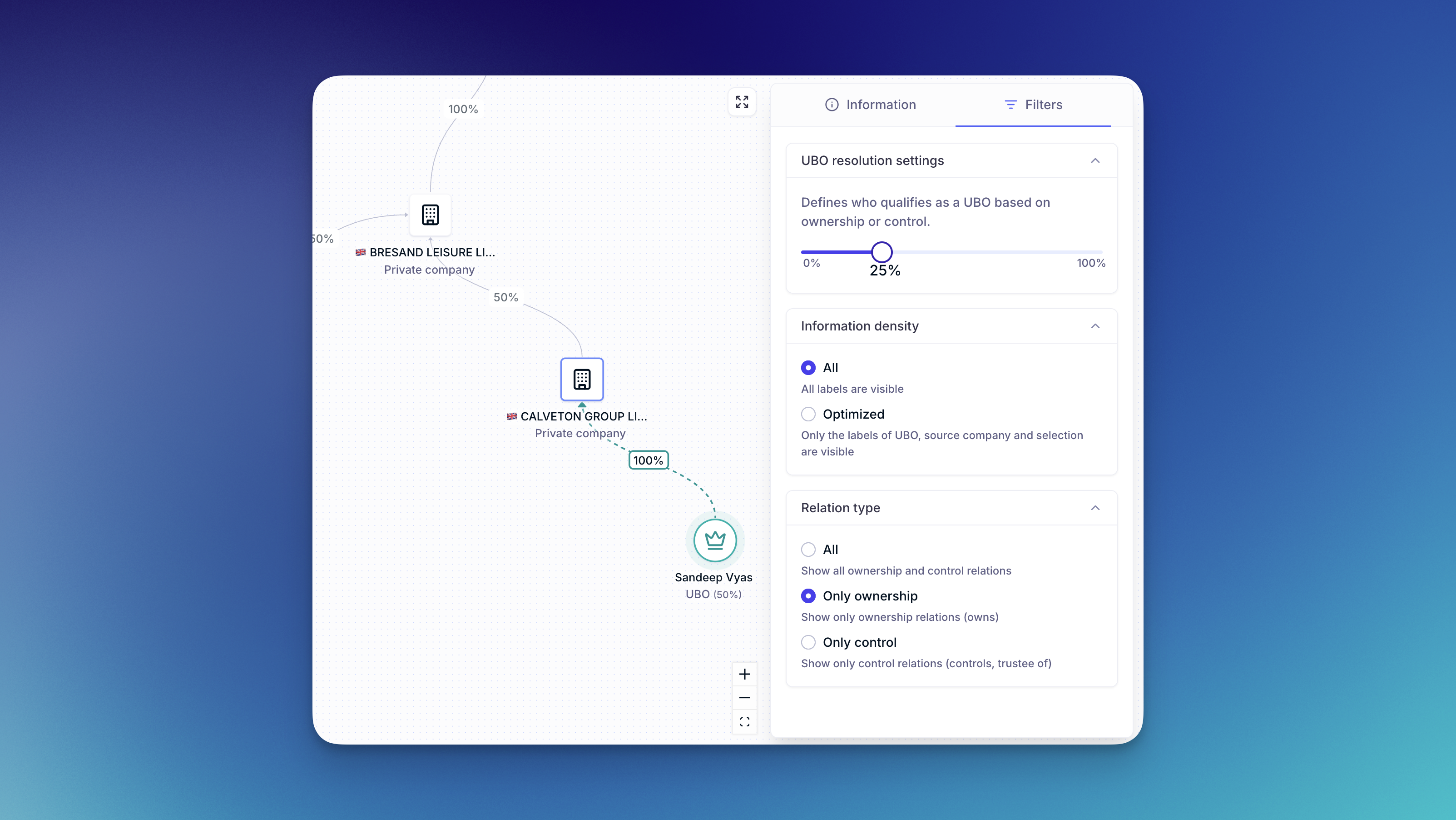 Relation type filters: Filter to show all relations, ownership only, or control only.