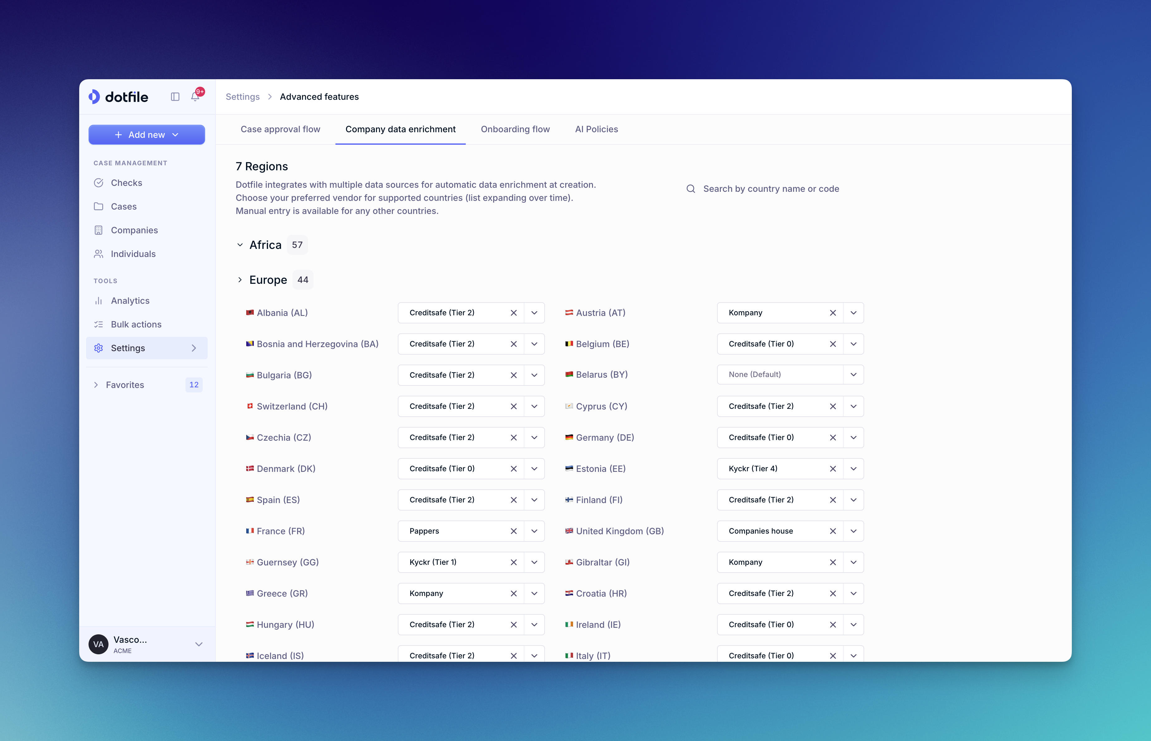 By default, the Unravelling with use the company registry vendors selected for the geography of the company being unravelled. This can be edited in the Advanced setting section.